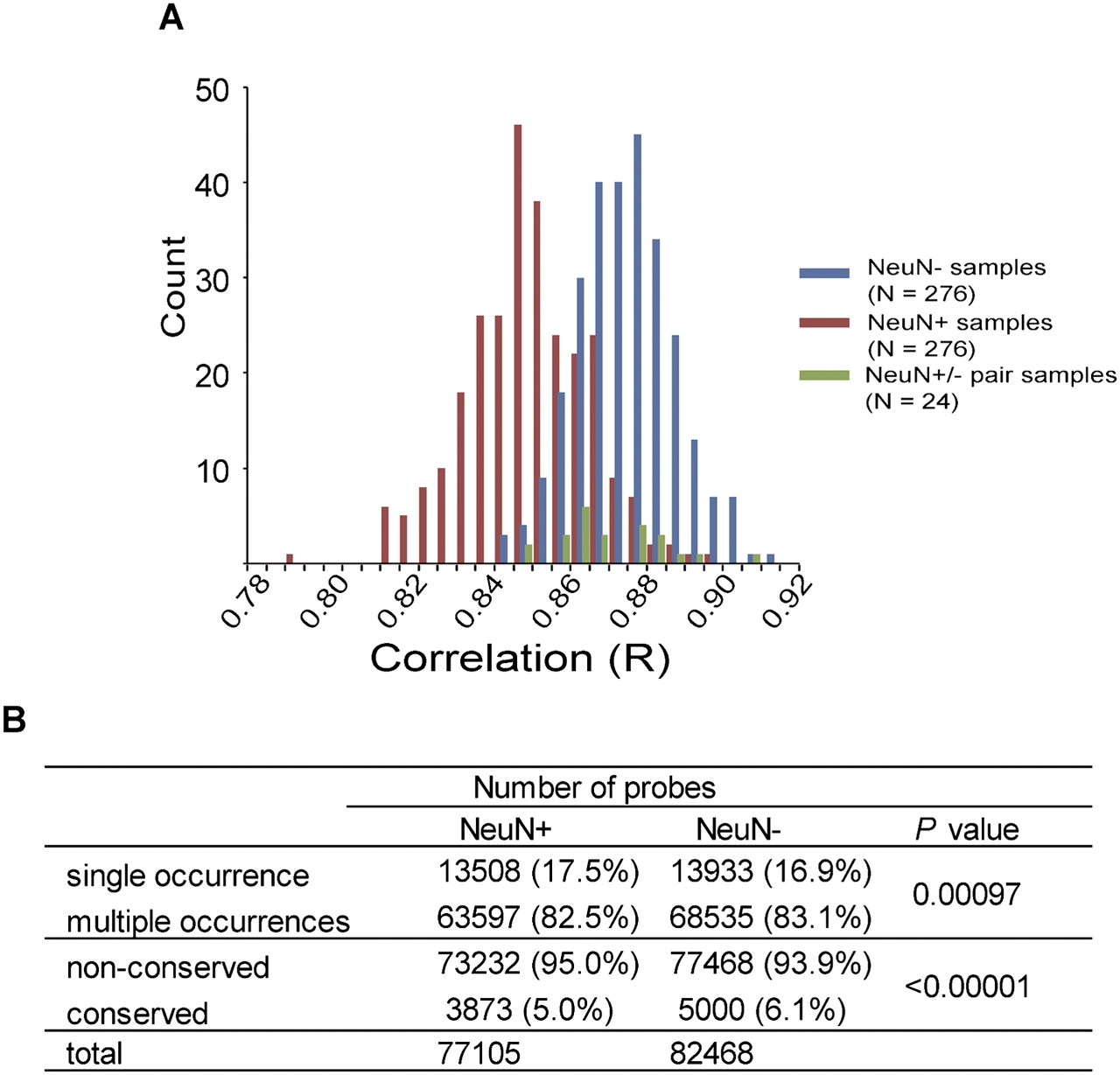Confirmation of higher variations in neurons compared with non-neurons. (A) Histogram of correlation determined in independent samples (n = 24 male control subjects). Pairwise correlation coefficients were plotted. Red, blue, and green bars indicate comparison between NeuN+ samples, between NeuN− samples, and between NeuN+ and NeuN− from the same subject, respectively. (B) Interindividual variations of the location of neuronal and non-neuronal MRs. Single occurrence: methylated probes found in one subject. Multiple occurrences: methylated probes shared by more than two subjects. Nonconserved: methylated probes in one subject or shared by up to 23 subjects. Conserved: MRs methylated probes shared by all subjects. P-values are determined by the Fisher exact test.