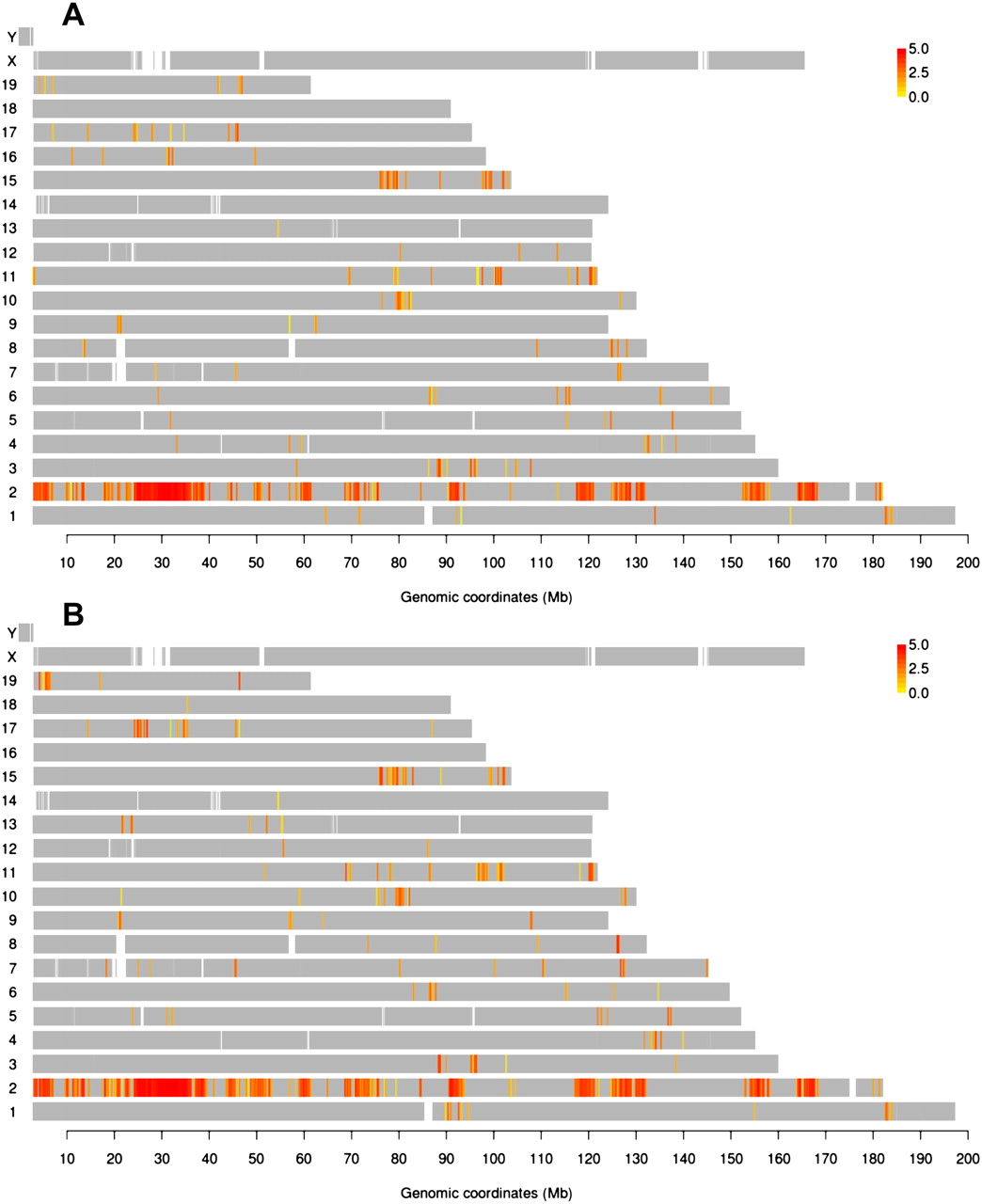Lcn2 is engaged with genomic loci in cis and in trans across the mouse genome before and after induction by Dex. Genomic map of Lcn2 contacts before (A) and 1 h after induction by Dex (B). Probes with P-values above the threshold (p score = −log10 p > 4: 0.3% FDR) are labeled in a yellow-to-red color scale according to the intensity of the probe signal (log2 4C/genomic DNA). (Gray) Probes with P-values below the threshold.
