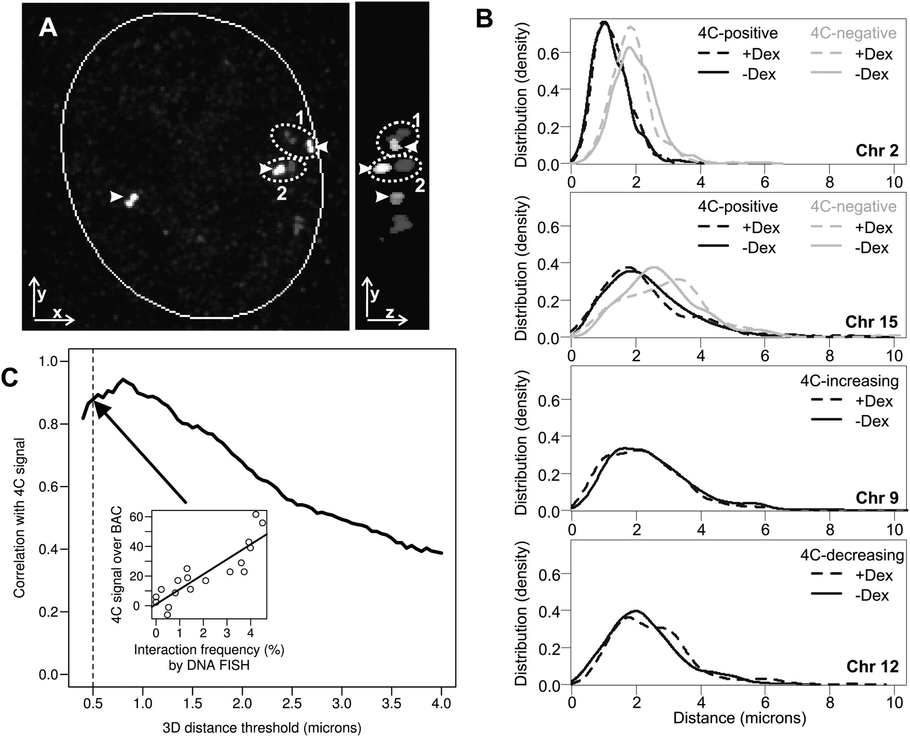 High correlation between 4C and 3D DNA FISH. (A) Automated image analysis computer algorithm for measuring the three-dimensional distance between the centers of two DNA FISH signals. (Left panel) Example of a nucleus from imaging DNA FISH as presented by 2D xy projection. The Lcn2 locus on chromosome 2 (arrowhead) and a locus on chromosome 8 in the nucleus. From this view, pair 2 is the closest one. (Right panel) yz view of the nucleus showing that the upper pair of FISH foci (1) is closer than pair 2 in 3D. (B) Distribution of 3D distances between Lcn2 and other loci as determined by DNA FISH, before (solid line) and after (dashed line) induction by Dex. (Top panel) Distances between Lcn2 (at Chr2: 32 Mb) and a locus scored positive (at Chr2: 164 Mb, black) or a locus called negative (at Chr2: 141 Mb, gray) by 4C for intrachromosomal interaction. (Second from top) Distances between Lcn2 and a locus scored positive (Chr15: 102 Mb, black) or a locus called negative (Chr15: 20 Mb, gray) by 4C for interchromosomal interaction. (Bottom two panels) Distance distributions for loci that had an increase (Chr9: 108 Mb) or a decrease (Chr12: 105 Mb) in 4C signals with respect to Lcn2. To estimate the distribution density, 200–1000 cells were examined by the automated algorithm for each probe and condition (see Supplemental Table S3; BACs [A, C], [H, I], E, and G correspond to the four panels, from top to bottom). (C) Robust correlation between the 4C contact probability and interaction frequency by 3D DNA FISH over different FISH distance thresholds. Interaction frequency (percentage of cells containing Lcn2 contact) was determined by calculating the proportion of nuclei that had the two FISH signals within a set distance threshold (center-to-center in 3D). The distance threshold was varied from 0.4 to 4 μm, and the corresponding correlation coefficient between the integrated 4C signal over BAC and interaction frequency by DNA FISH was calculated for each threshold on all the experiments (see Supplemental Table S3). (Inset) An example correlation for a distance threshold at 0.5 μm.