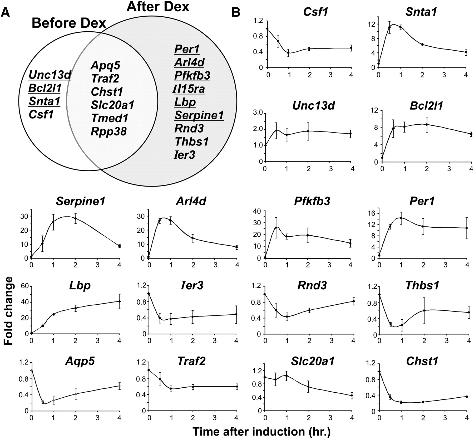 Genes with opposite transcriptional responses to GR colocalize with Lcn2. (A) GR induced (underlined) and repressed (not underlined) genes from Affymetrix exon expression array analysis, located within Lcn2 contact regions before and after 1 h of hormone treatment. First, all genes in the Lcn2 contact regions were obtained by retrieving genes whose TSS is located within 10 kb of 4C positive probes (excluding the bait region). Genes were considered GR-responsive if their expression changed by more than twofold after Dex treatment. (B) Time-course analysis by qRT-PCR of nascent transcript levels of GR-regulated genes located within Lcn2 contact regions. Samples were collected before Dex treatment and 0.5, 1, 2, and 4 h after Dex induction. Results shown are the average of three independent experiments, with SD presented as error bars.