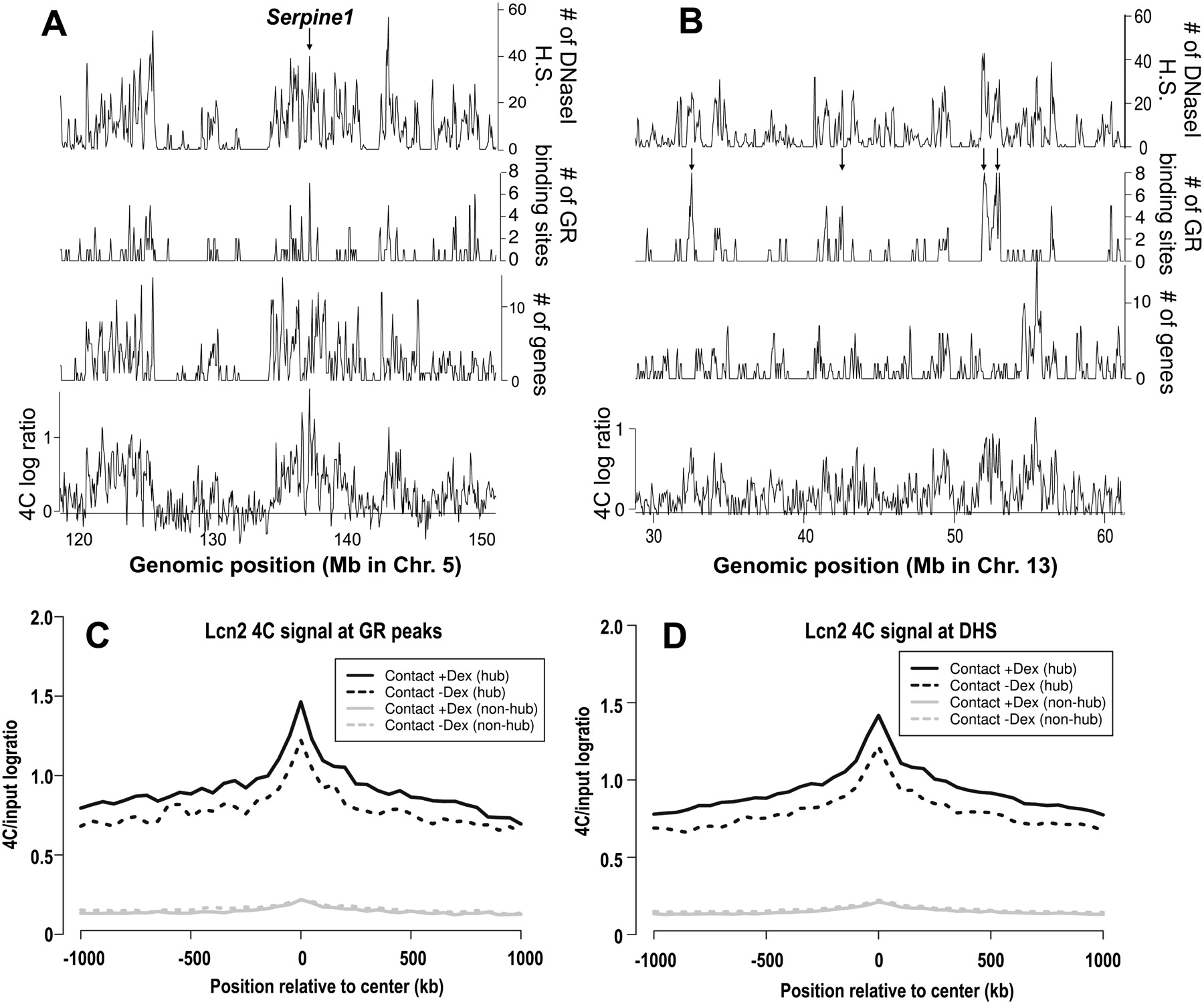 Lcn2 contact regions tend to be gene-dense or in close proximity to numerous GR-binding sites and DHS. (A,B) Profiles of Lcn2 4C signal 1 h after Dex treatment (average log2 ratios/100 kb), gene density (number of TSS/100 kb), GR-binding density (number of binding sites/100 kb), and the density of DHS after Dex (number of DHS/100 kb). (Arrow in A) The location of a GR-regulated gene, Serpine1. (Arrows in B) Point to contact regions in gene-poor regions that have numerous clustered GR-binding and DHS sites, showing that the enrichment of GR-binding and DHS sites can be observed independently of gene density in the contact loci. The genomic position in mm8 coordinates is indicated on the horizontal axis. Additional examples are provided in Supplemental Figure S5. (C,D) Average Lcn2 contact probabilities increase at GR-binding sites and DHS after Dex induction. Mean 4C signal (solid, after Dex; dashed, before Dex) centered at genome-wide GR binding sites (C) or DHS (D). Sites that are within 10 kb of Lcn2 contact loci (pooled from loci before and after Dex) were under the “hub” category (black), and those located at least 200 kb from Lcn2 or Arrdc2 contacts were included in the “non-hub” category (gray).