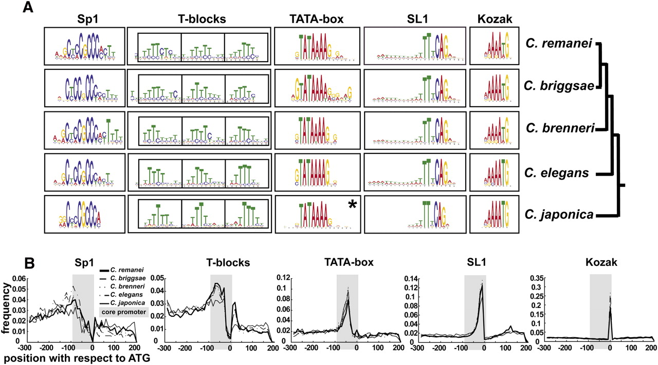 Motif composition of the Caenorhabditis core promoter. (A) Five conserved motifs in each of the five examined Caenorhabditis species are shown as sequence logos. (*) In contrast to all other motifs which were found in the initial search, the Caenorhabditis japonica TATA box motif was detected only in sequences whose orthologs contained the “TATA” motif. (B) Distribution of motif occurrences along the sequence. The gray box in each plot corresponds to the core promoter. The C. japonica SL1 motif was normalized to the length of the other species.