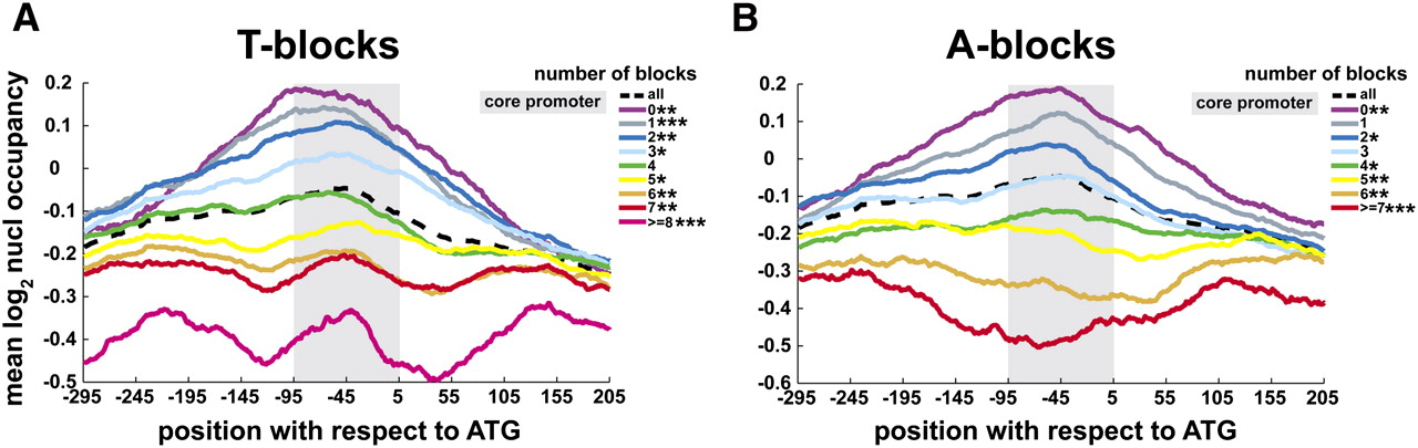 The number of T-blocks and A-blocks correlates with nucleosome eviction. (A) For each set of genes with a given number of T-blocks, the mean log2 nucleosome occupancy is shown for each base pair in the −296 to +205 region with respect to the ATG. The mean nucleosome occupancy for all genes in this region is indicated by the dashed line. Significance of differences between the distribution of particular T-block counts and the genome average are indicated as stars in the legend (*, P < 10−5; **, P < 10−10; ***, P < 10−20). (B) The same as A for A-blocks. The normalized nucleosome occupancy data was obtained from Valouev et al. (2008).