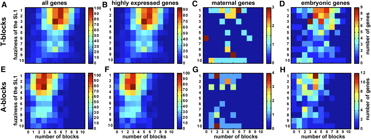 Operon genes have a high number of T-blocks, a precise SL1 motif and are highly expressed. (A–H) The heat maps are in the same format as in Figure 7.