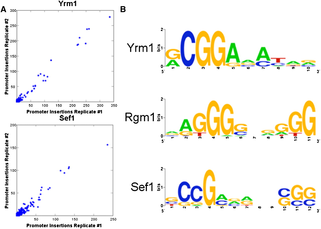 Multiplexing experiments are reproducible and productive, and the Calling Card–seq method performs well when the TF–Sir4 is expressed from its native genomic locus. (A) The number of independent Calling Card insertions within each promoter is plotted for two biological replicate experiments multiplexing eight TFs. Data for Yrm1 and Sef1 are shown here. (B) Sequence logos for newly discovered TF binding site motifs.