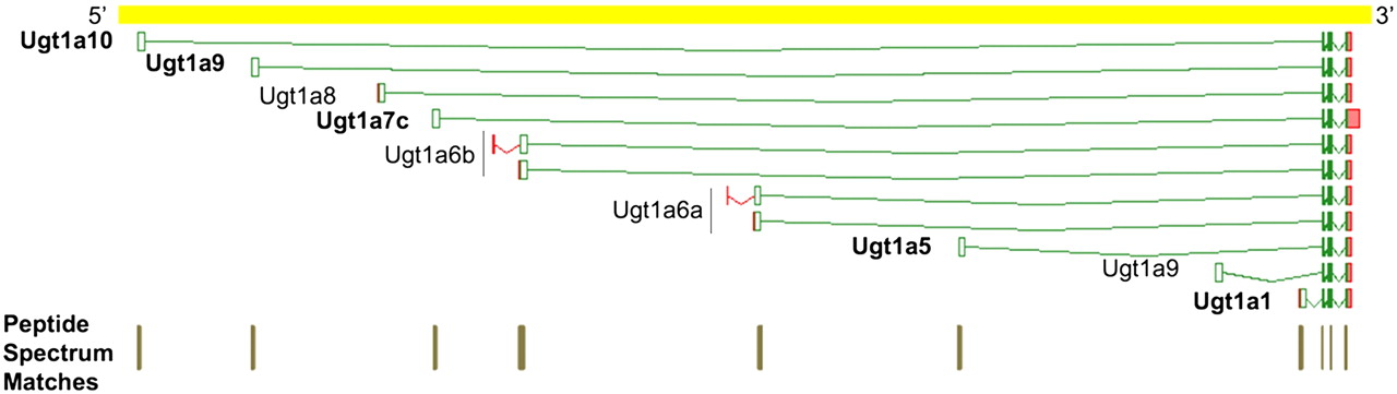 MS PSMs confirm the protein-coding potential of five alternatively translated products of the UDP-glucuronosyltransferase 1 family, polypeptide A6 (highlighted in bold). Ambiguous PSMs are shown for the two alternatively spliced transcripts of the Ugt1a6a and Ugt1a6b genes, respectively; and as clusters for each of the 3′ exons.