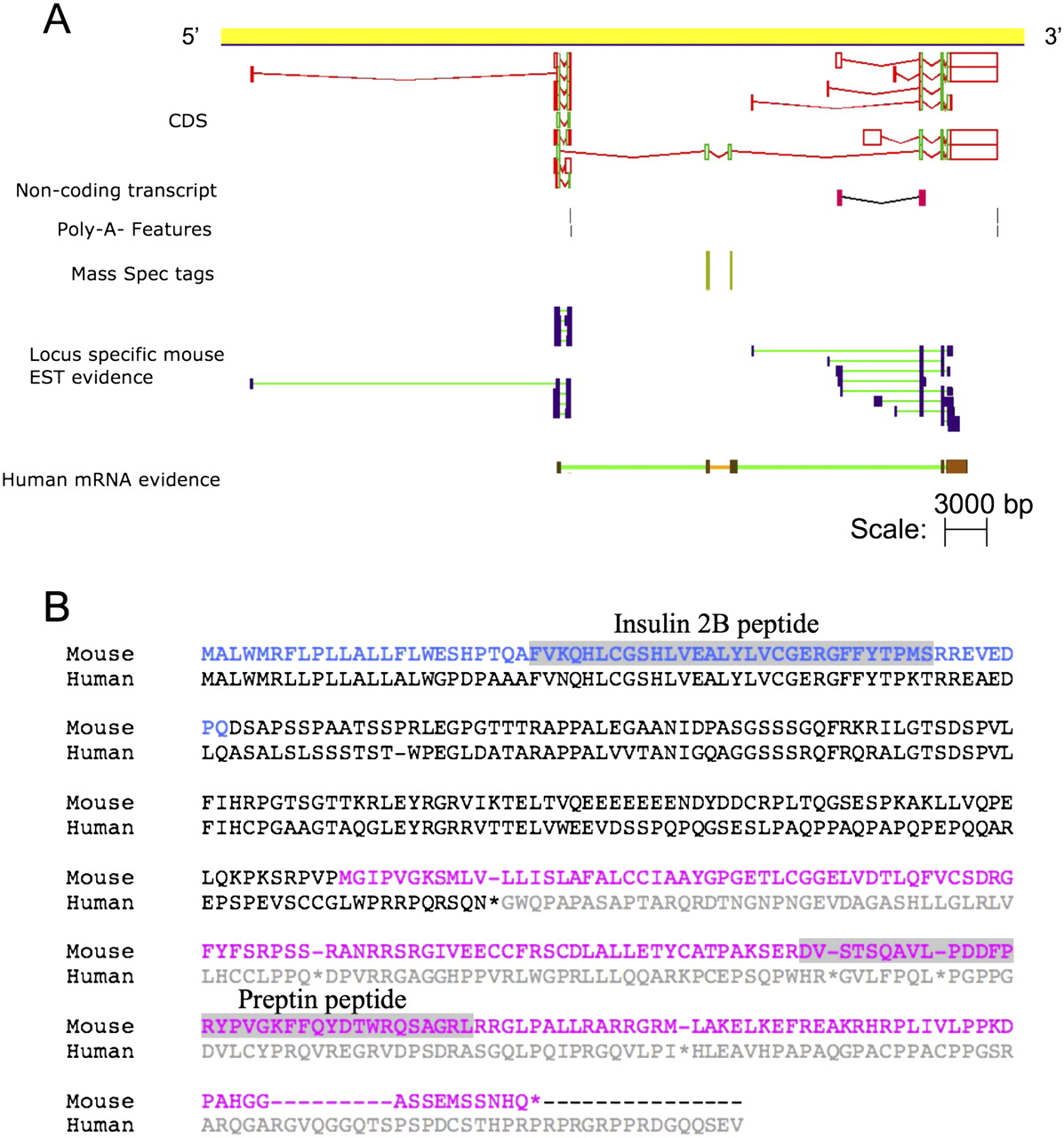 (A) Mouse Ins2-Igf2 fusion object contains a valid CDS, supported by human cDNA and species-specific peptide evidence. (B) Clustal alignment of the translation of the mouse and human fusion transcripts. This human translation would be a target for the NMD pathway due to a frame-shift mutation, caused by the inclusion of an additional exon not present in the mouse transcript. The residues of the Ins2 and Igf2 polypeptides are colored blue and pink; with the known domains within each highlighted in gray.