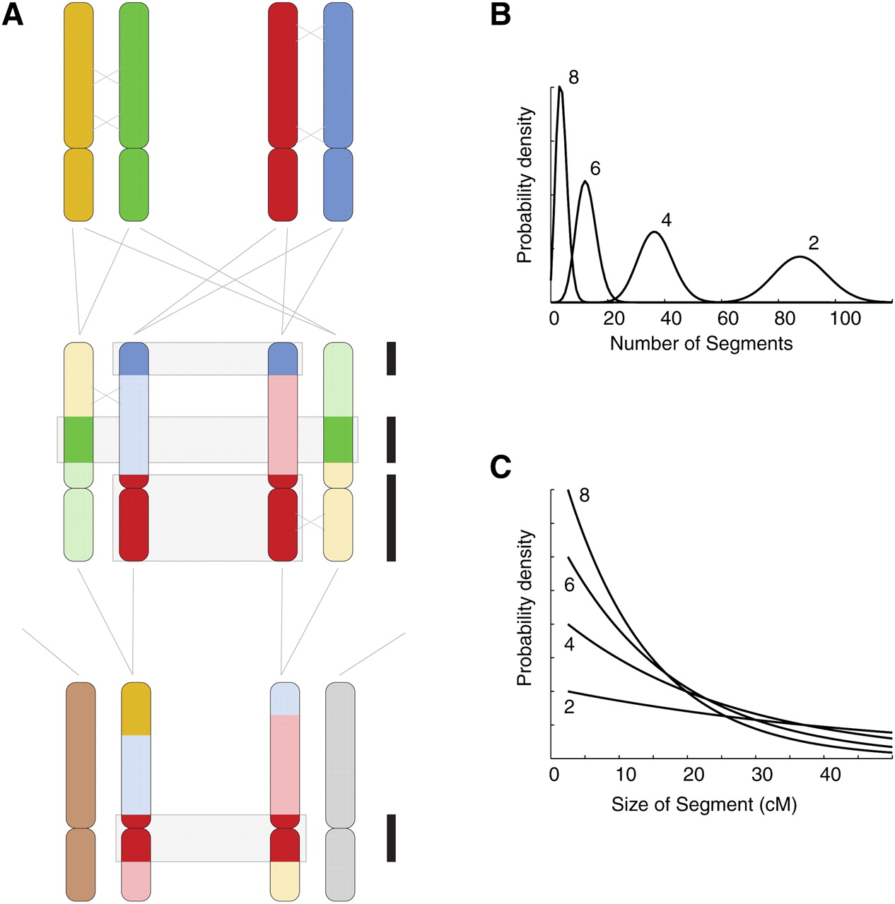 Expected distributions of IBD chromosomal segments between pairs of individuals. (A) The process underlying the pattern of IBD segments. Two homologous autosomal chromosomes are shown for two parents, each colored differently. Meiosis and recombination occur, and two sibling offspring inherit recombinant chromosomes (just one crossover per homologous pair for each meiosis event is depicted, marked by an X). For some segments of the chromosome in question, the siblings share a stretch that was inherited from one of the four parental chromosomes. The three IBD segments are identifiable as regions that share the same color (boxed and marked at right by black bars). The siblings mate with unrelated individuals, and the offspring each inherit an unrelated chromosome (tan or gray) and one that is a recombinant patchwork of the grandparental chromosomes. These first cousins share one segment IBD at this chromosome (red, boxed). (B) The number of segments that a pair of individuals shares IBD, across all chromosomes, is approximately Poisson-distributed with a mean that depends on the number of meioses d on the path relating the individuals (d = 2, 4, 6, 8, corresponding to siblings through third cousins). (C) The lengths of the IBD segments are approximately exponentially distributed, with mean length depending on the relationship between individuals (theoretical distributions shown for d = 2, 4, 6, 8).