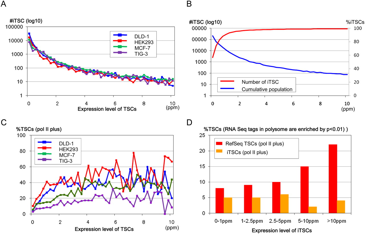 Characterization of intergenic TSCs. (A) The numbers of iTSCs at the indicated expression level (x-axis) are shown. (B) Numbers and cumulative populations of the iTSCs with maximum expression levels, as indicated on the x-axis, in 12 cell types. (C) Frequencies of the iTSCs that overlapped the pol II binding sites. Origins of the cell lines are as indicated in the inset. (D) The frequencies of the iTSCs for which the RNA-seq tags in the polysomal fractions of DLD-1 cells were enriched (P < 0.01) in comparison to the nuclear and cytoplasmic fractions.