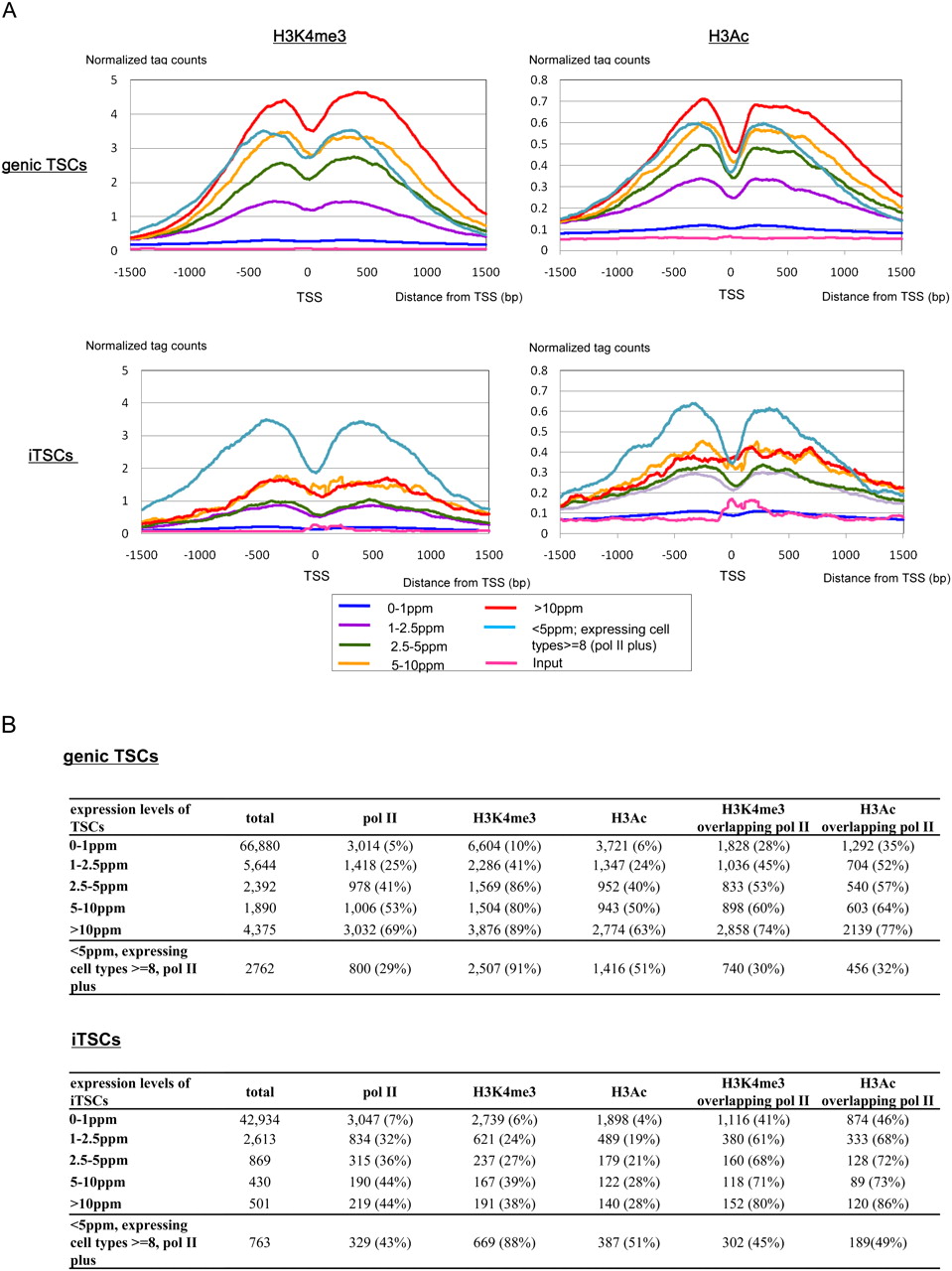 Histone modifications in regions surrounding the TSCs. (A) Average tag concentrations (y-axis) obtained in ChIP-seq analyses of H3K4me3 (left) and H3Ac (right) in the surrounding regions of genic TSCs (top) and iTSCs (bottom) for DLD-1 cells. Expression levels of the TSCs are indicated in the insets. (B) Number of TSCs overlapping the indicated signals. For the extensive analysis using the nucleosome-seq data, see Supplemental Figure S9.