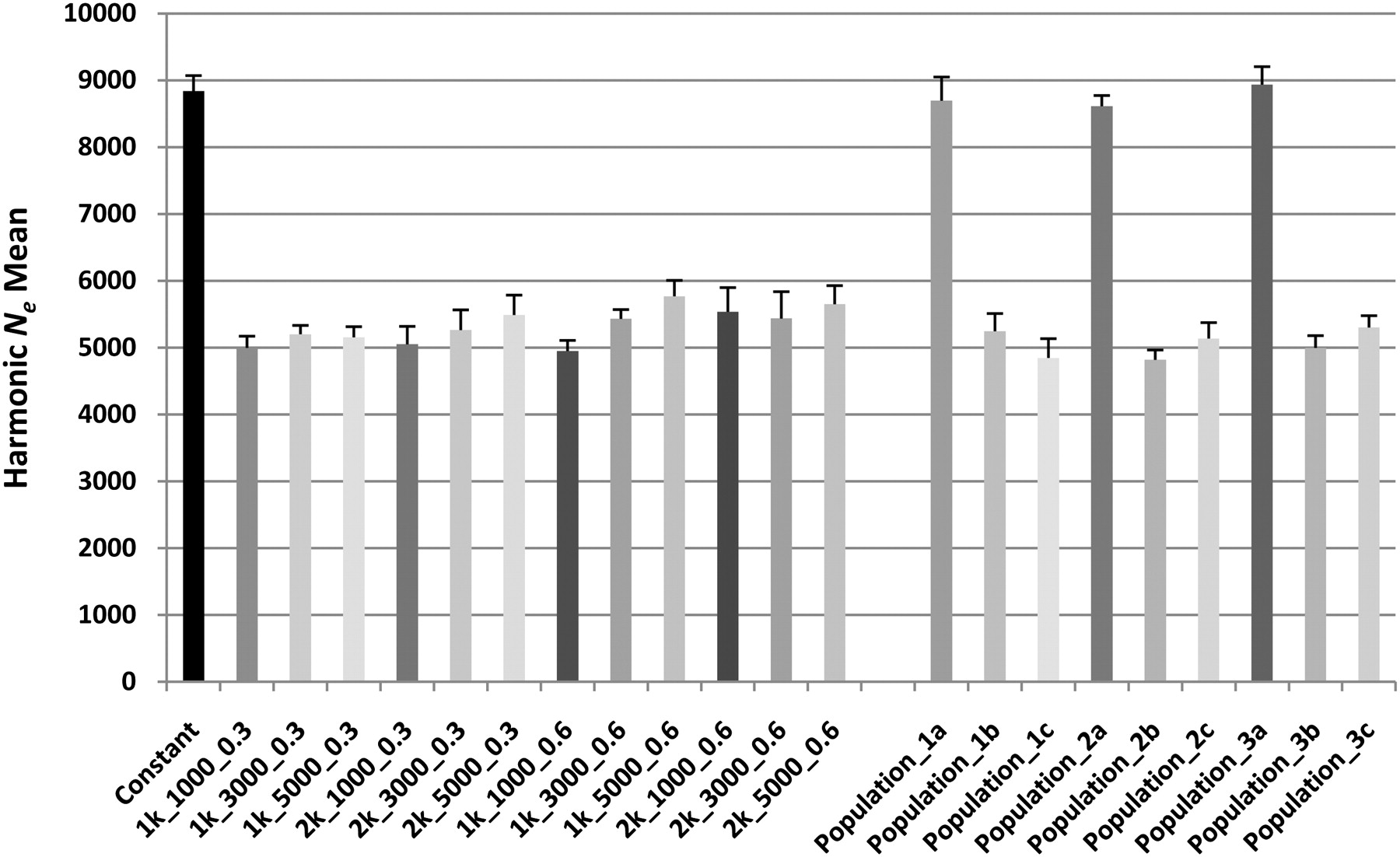 The harmonic mean of Ne for each simulated population scenario over all genetic distances between 0.05 and 0.25 cM. The Ne illustrated is the mean from 100,000 independent simulations, with standard errors shown with error bars. The population characteristics are described in Methods and Supplemental Figure 7.