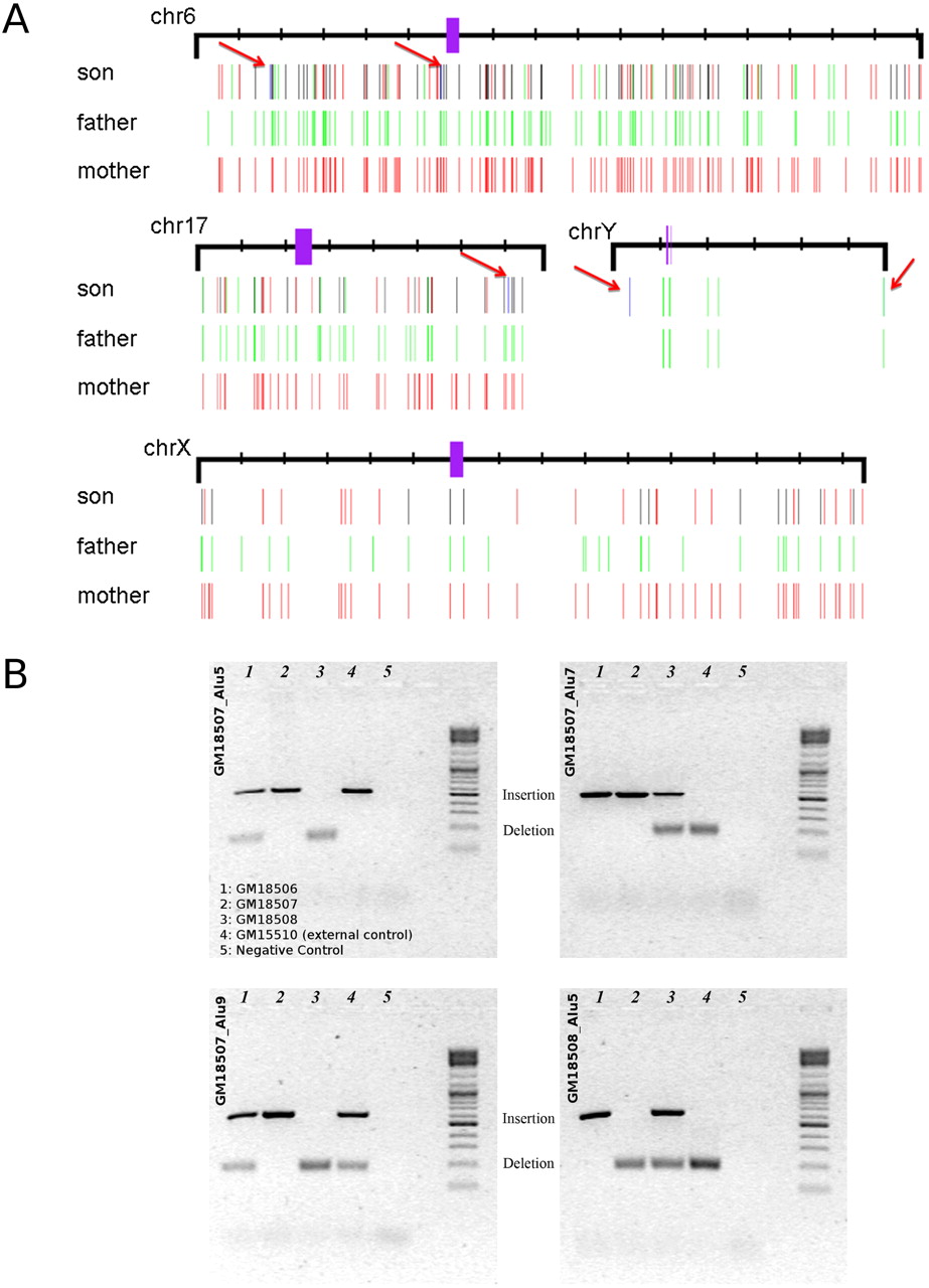 Alu insertions predicted in the Yoruban parent–child trio. (A) Novel Alu integration sites for four chromosomes are shown. Alu sequences transmitted from the father (green) are compared with those transmitted from the mother (red). Purple bars represent centromeres and black bars denote Alu insertions shared by both parents and transmitted to the offspring. In these chromosomes, five de novo insertions were predicted in the child (blue), and further marked with a red arrow. Note that the predicted de novo Alu insertion in distal location in chromosome Y is very close to a transmitted integration, and it is difficult to see at this resolution. (B) PCR validation results for three individuals for four different loci (GM18507_Alu5, GM18507_Alu7, GM18507_Alu9 and GM18508_Alu5).