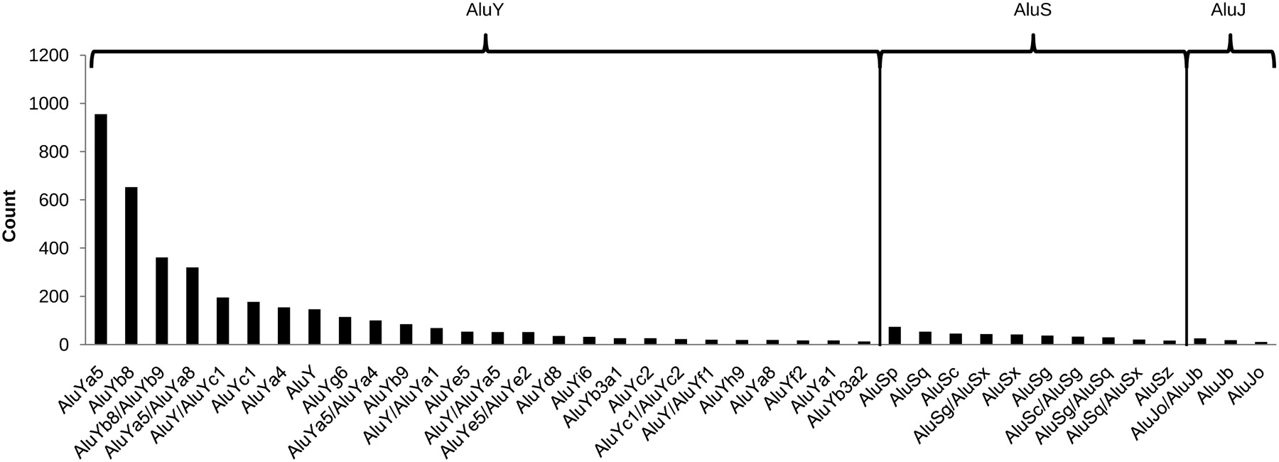 Alu frequency distribution among subfamilies. We show the number of predicted Alu integrations in the eight genomes separated by the inferred Alu subfamilies. As expected, AluY class had the highest frequency, where AluJ was the rarest. The Alu classes (AluY, AluS, AluJ) are sorted from youngest to the oldest.