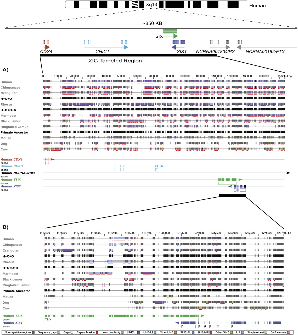 Repeat content and alignment across the XIC. (A) The candidate XIC region is shown along the top with a horizontal black bar indicating the smaller XIC region targeted in this study. Aligned sequence for each species is color-coded based on DNA sequence content, with nonrepetitive sequence indicated by black shading and different repeats color-coded according to the legend along the bottom. (Red bars below the sequence) Repetitive regions identified by RepeatMasker. Three ancestrally reconstructed sequences (H+C+O, H+C+O+R, and Primate Ancestor) are indicated for comparison of which regions have been gained or lost throughout primate evolution. Below the aligned sequences are the exonic regions annotated based on the human gene structures. The two exons of JPX occupy such a small space that they do not resolve as separate entities in this overview. (B) The aligned region expanded for TSIX and XIST is shown.