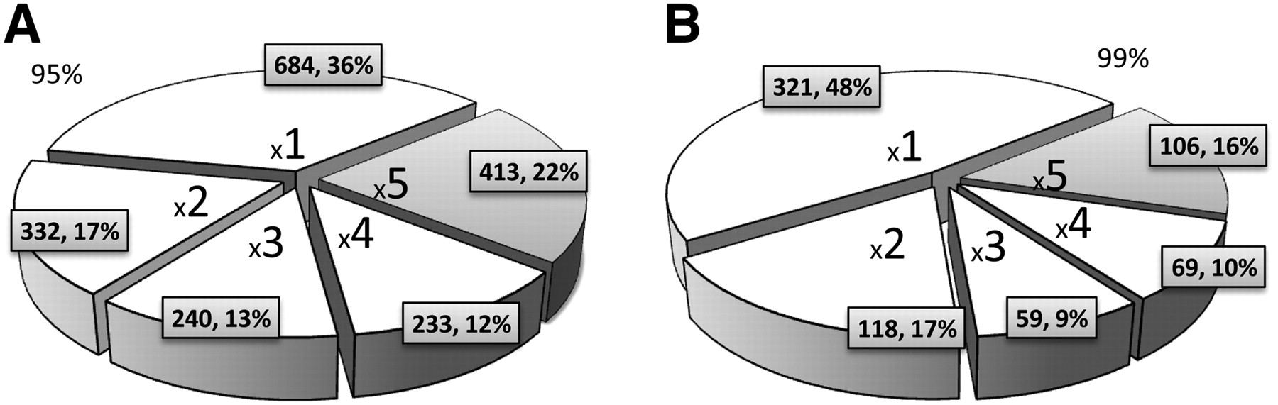 Number of genes that were predicted to have a positively selected site with cutoff posterior probability set at 95% (A) and 99% (B) by exactly 1, 2, 3, 4, or 5 aligners when using PAML models M7 and M8 (out of the genes with at least one such prediction).