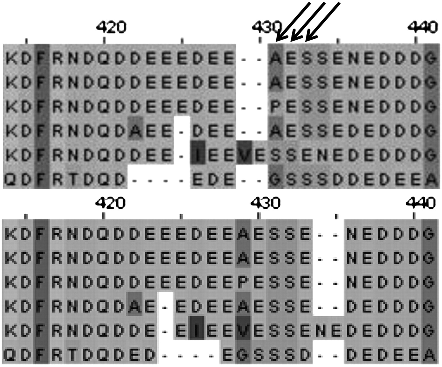 Example alignment from the genes that we performed visual inspection on. The illustrated alignment segment is from the melanogaster group alignments of gene FBgn0036686. The top alignment was made with T-Coffee and has three sites inferred under selection at 99% cutoff. The bottom alignment was made with ProbCons; the highest posterior probability in this region for the ProbCons alignment is 60%.