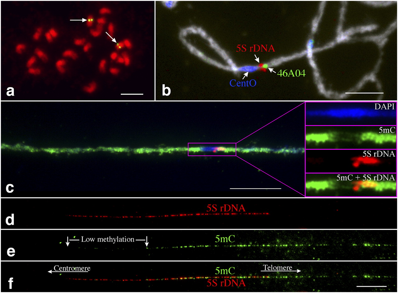 The hypermethylation–hypomethylation transition zone in the centromeric region of rice chromosome 11. (a) FISH mapping of the 5S rDNA on somatic metaphase chromosomes of rice. Arrows point to the single 5S rDNA locus (green) on rice chromosome 11. Bar, 5 μm. (b) Three-color FISH mapping of BAC clone 46A04 (green), 5S rDNA (red), and the CentO satellite repeat (blue) on meiotic pachytene chromosome 11 of rice. BAC 46A04 is the closest clone flanking the telomeric side of the 5S rDNA locus. Bar, 5 μm. (c) Immunodetection of 5mC on a super-stretched rice pachytene chromosome 11. The purple box includes the centromeric region, and the fluorescent signals in this region are exemplified and separated into different color channels. The 5S rDNA locus is located within the hypermethylation–hypomethylation transition zone. (d–f) Differential methylation along the 5S rDNA locus revealed by immunodetection of 5mC on DNA fibers. Approximately 41% of the 5S rDNA section toward the centromere is less methylated than the rest of the 5S rDNA array. Bars, 10 μm.