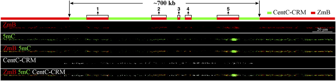 Mapping of DNA methylation in the centromere of maize B chromosome. The positions of the five ZmB arrays (1–5) in the functional centromere are labeled. Fiber-FISH of ZmB (red) and CentC-CRM (the white signals were digitally converted from blue fluorescence signals) and detection of 5mC (green) were performed on the same DNA fiber. (Top panel) A diagram of the DNA composition of the maize B centromere. The functional B centromere spans ∼700 kb and contains five distinct arrays (1–5) of the ZmB repeat. The association of this 700-kb region with CENH3 was previously demonstrated by Jin et al. (2005). Each ZmB repeat array is flanked by intermingled CentC and CRM repeats.