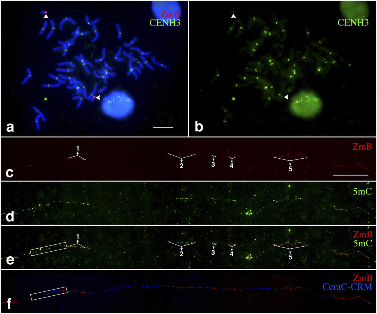 Mapping of DNA methylation in the centromere of a maize B chromosome in an oat genetic background. (a) A metaphase cell, derived from the oat–maize B chromosome addition line, was analyzed with an immunofluorescence assay using a maize anti-CENH3 antibody combined with FISH using a ZmB probe. The arrowheads point to the two B chromosomes. Bar, 10 μm. (b) Digitally separated CENH3 signals from the immunofluorescence assay. Arrowheads point to the CENH3 signals from the B chromosomes. (c) Fiber-FISH signals from the ZmB repeat located in the B chromosome in an oat genetic background. Bar, 20 μm. (d) Detection of 5mC on the same DNA fiber as c. (e) A merged image of the ZmB and 5mC signals. The region immediately flanking the first ZmB array is boxed and shows a similar methylation level as the ZmB arrays. (f) Fiber-FISH signals derived from ZmB (red) and a mixed probe with both CentC and CRM sequences (blue). The box, which covers the same region as in e, includes CentC-CRM sequences.