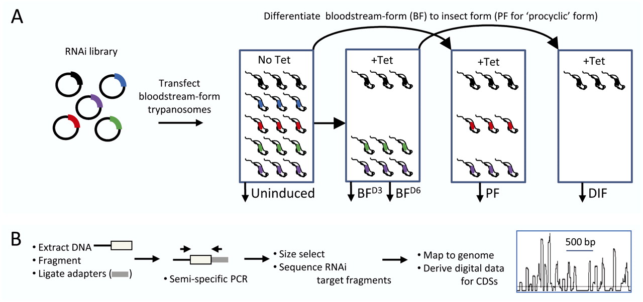 RIT-seq. (A) Schematic of the RNAi library and the growth conditions analyzed. The RNAi target fragment provides a unique identifier for each cell and its progeny, while dsRNA production is induced by tetracycline (Tet) addition (Fig. 1). Five different possible outcomes are illustrated. (B) Schematic of amplification, sequencing, and mapping of the RNAi target fragments. Only sequences containing a terminal RNAi-vector junction sequence, GCCTCGCGA, were mapped. The box shows a sample region with sequence mapping frequency viewed in Artemis (Carver et al. 2008); each peak represents a unique RNAi target fragment.