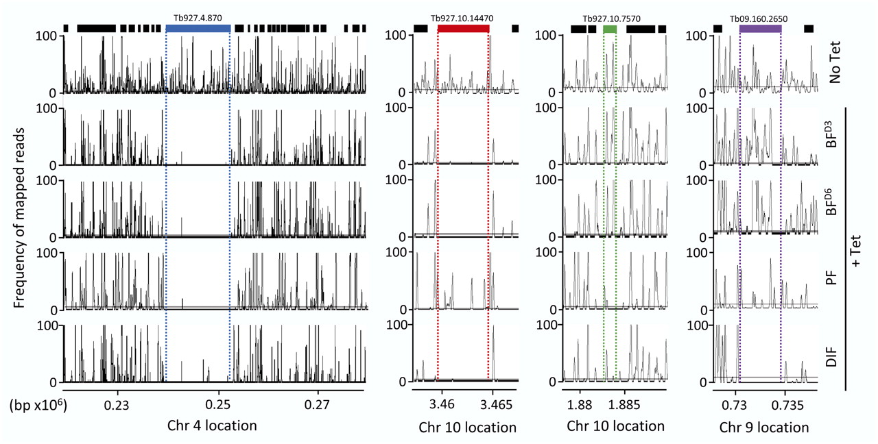 Example plots in Artemis of the four different loss-of-fitness patterns illustrated in Figure 2; mRNA ablation is associated with a defect in all four induced conditions (blue), a more pronounced defect in bloodstream form cells (red) or procyclic cells (green), or a differentiation defect (purple). Cells carrying RNAi target fragments that negatively impact fitness through dsRNA expression and RNAi-mediated ablation are relatively depleted as the population expands and these changes are reported by the depth of sequence coverage relative to the uninduced control (no Tet). Each peak represents a unique RNAi target fragment. The genes shown encode a dynein heavy chain (Tb927.4.870), an intraflagellar transport protein (Tb927.10.14470), dihydrolipoamide acetyltransferase (Tb927.10.7570), and an uncharacterized zinc ion binding protein (Tb09.160.265).