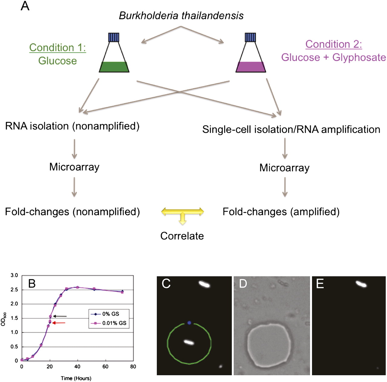Single B. thailandensis cell isolation. (A) Experimental design for evaluating the single-cell transcript amplification method. B. thailandensis grown in two different conditions were used in large-scale (nonamplified) and single-cell level (amplified) microarray analysis. Fold-changes (between condition 1 and 2) of all genes detected from the nonamplified and amplified samples were then compared by correlation analysis. (B) Comparable growth curves of B. thailandensis in MG medium ± 0.01% GS (w/v) added at mid-log phase (red arrow) and harvested 30 min post-exposure (black arrow). (C) Fluorescent B. thailandensis cells were observed under 1000× magnification. The section of the membrane containing a single bacterium was drawn and cut by the focused laser (green line) and catapulted at a distance from the cell with unfocused low-intensity laser beam (blue spot), which aseptically catapulted and isolated the single cell into the lid of a 0.2-mL PCR tube containing the cell lysis buffer. (D) Bright-field mode showing the section of the membrane where the single bacterium had been. (E) Fluorescence mode confirming that the bacterium of interest has been transferred from the membrane slide to the PCR tube lid.