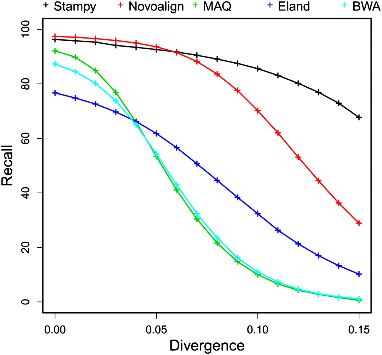 Recall rates for 72-bp paired-end reads at a range of divergences to the human reference (horizontal axes; average number of substitutions per site). For results for shorter and single-end reads, see Supplemental Figure S12.