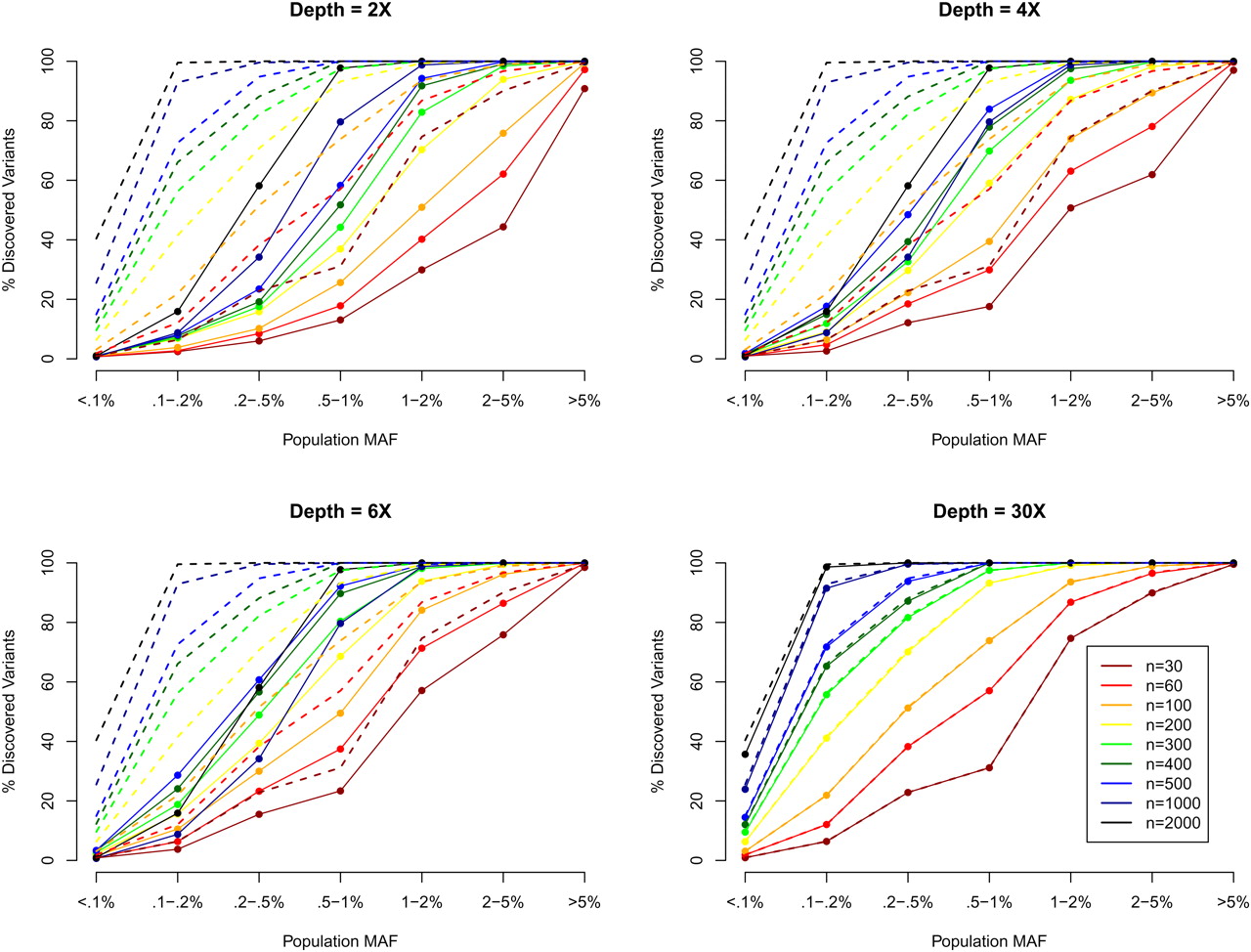 SNP discovery (%) by MAF, sequencing depth, and sequencing sample size. We simulated 30–2000 individuals sequenced at depths 2×, 4×, 6×, and 30×. We plotted the % of SNPs discovered by population MAF category (<0.1% to >5%), where population MAF is for the 45,000 simulated chromosomes. The dotted lines show the % of SNPs in each population MAF category that is polymorphic among the sequenced individuals.