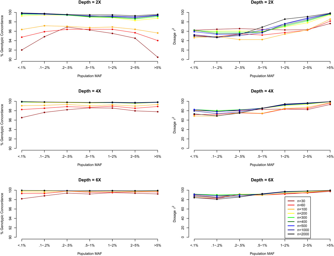 Genotype calling quality by MAF, sequencing depth, and sequencing sample size. We simulated 30–2000 individuals sequenced at depths 2×, 4×, and 6×. We compared genotype calls at detected SNPs with the simulated truth to obtain two measures of genotype calling quality, genotypic concordance and dosage r2, for each called SNP. We plot these two measures (left panel: genotypic concordance; right panel: dosage r2) by population MAF category (<0.1% to >5%), where population MAF is for the 45,000 simulated chromosomes.