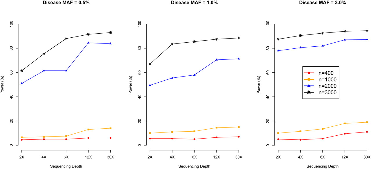Power of association mapping by sequencing depth and number of individuals sequenced. We simulated 1500 cases and 1500 controls, assuming a single causal variant with causal allele frequency 0.5%, 1%, or 3%. We sequenced all 3000 individuals or a random subset of 400, 1000, or 2000 individuals (equal number of cases and controls) at depths ranging from 2×–30×. Power was estimated using an empirical threshold determined from 500 null sets to ensure familywise type-I error of 5%.