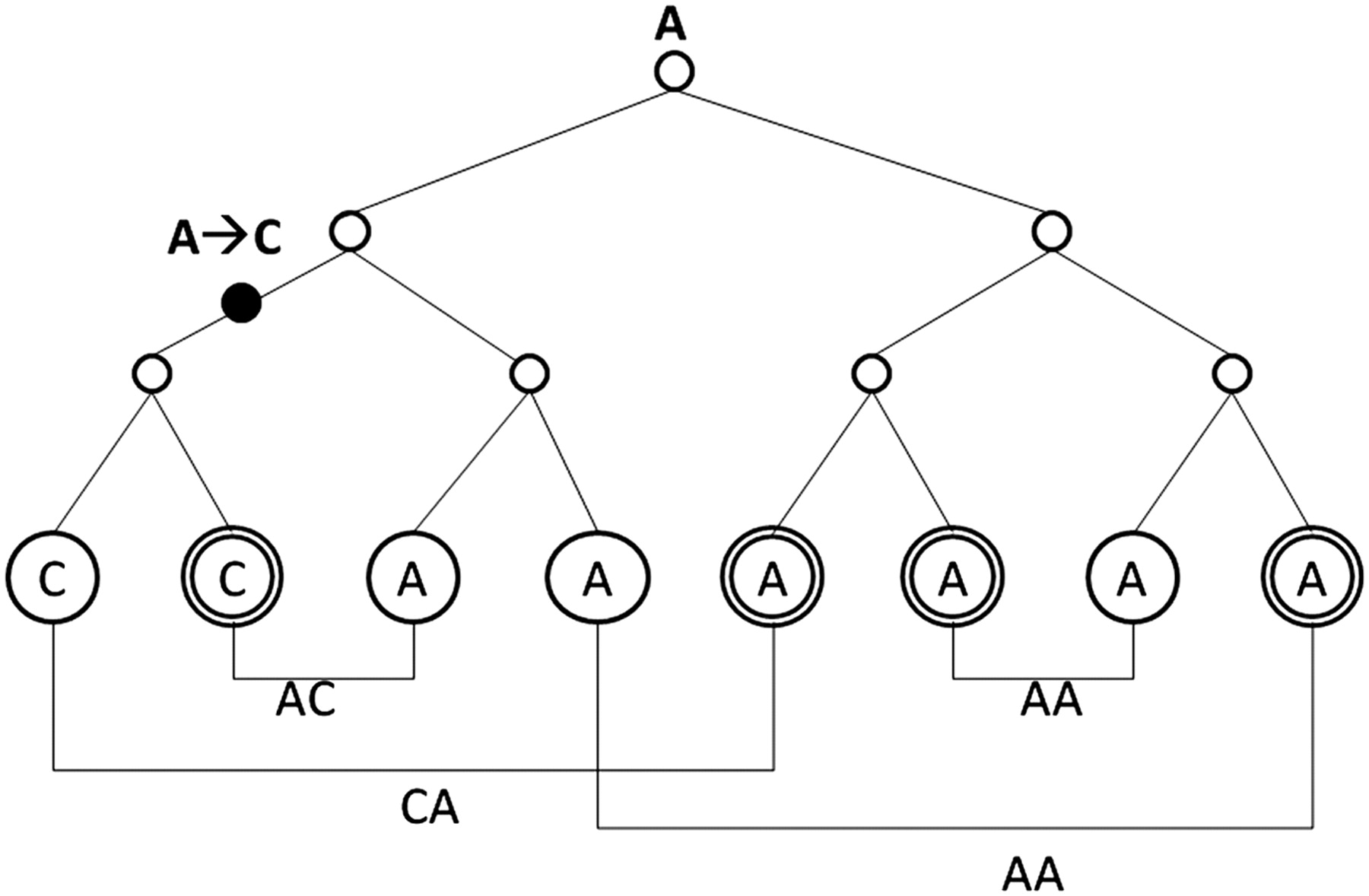 An illustrative example of a coalescent tree for four samples (eight haplotypes). Given a value at the root, A in this example, and a mutation from A to C in this example, we can infer genotypes for the four samples and, hence, compute the probability of data D conditional on this configuration. We estimate the likelihood of D given a tree t, p(D | t), by summing over all possible root values and mutations in t.