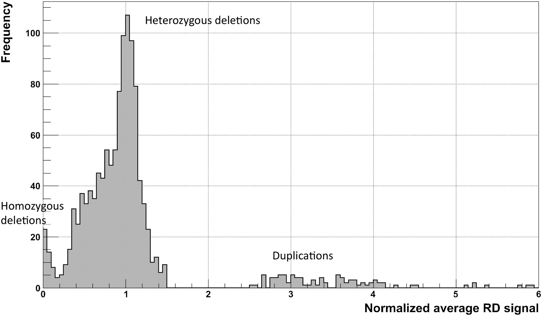 Distribution of normalized average RD signal for predicted CNVs (for a CEPH daughter) that are >1 kb and pass the q0 filter. The normalization factor is the double (two copies of each chromosome) of the genome-wide average RD signal. Two clear peaks (around 0 and 1) correspond to homozygous and heterozygous deletions. Slight displacement of the second peak (∼0.05) from a value of 1 is the result of read over-mapping in those regions, when choosing a mapping location for nonuniquely mapped reads (see Methods). Peaks for duplications are smeared, which reflects the larger variations in the RD signal and, as a consequence, the greater challenge in detecting and genotyping duplications.