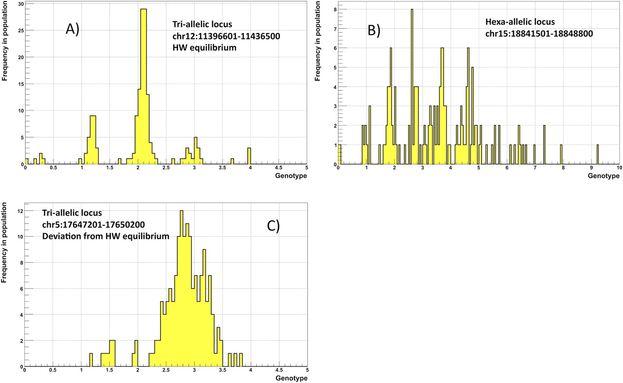 Examples of multi-allelic loci. (A) Tri-allelic locus with CN0, CN1, and CN2 is at Hardy-Weinberg equilibrium. (B) Distribution of genotypes across a population can be explained by hexa-allelic locus with CN0–CN5. (C) Tri-allelic locus that is not at Hardy-Weinberg equilibrium, which may indicate natural selection. In this case, the distribution of genotypes peaks around 3, with the likely explanation that an equal proportion of CN1 and CN2 alleles at this locus dominate the population. This, in turn, implies balancing selection.