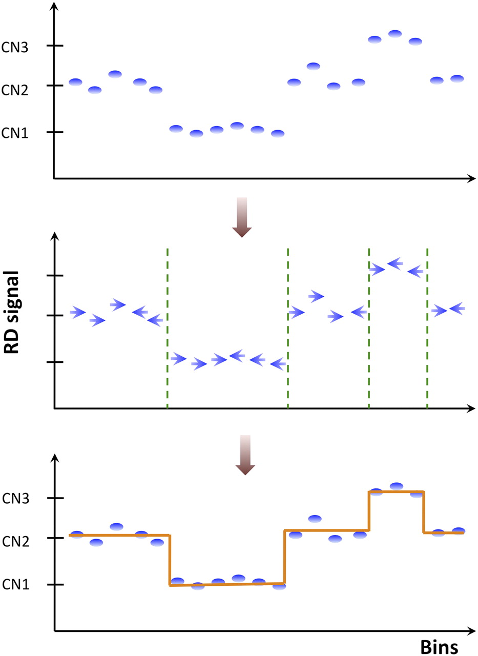 Schematics of mean-shift procedure. For each bin, i.e., data point, the mean-shift vector points in the direction of bins with the most similar RD signal. Segment breakpoints are determined where two neighboring vectors have opposite directions but do not point to each other.
