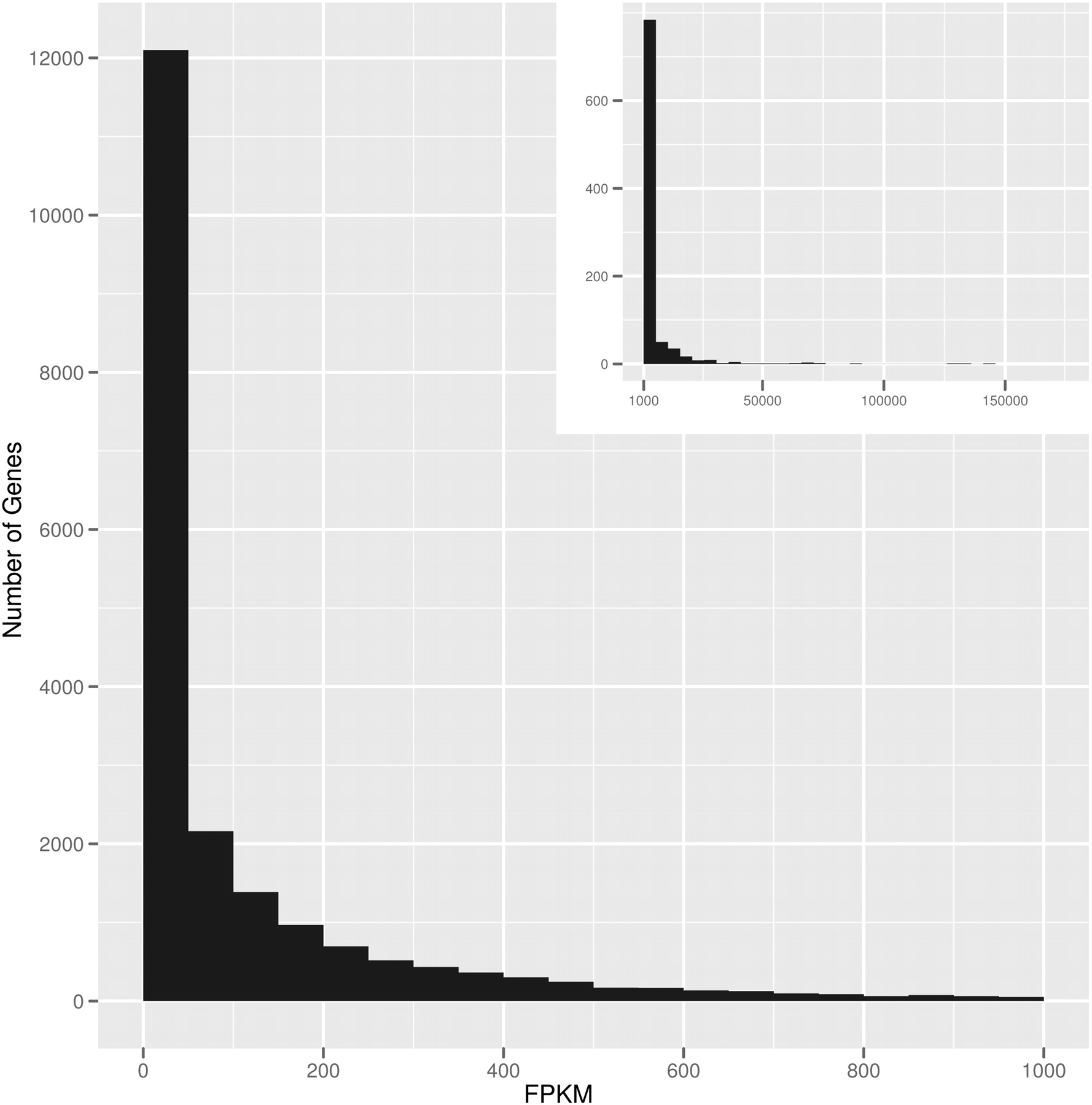 Distribution of FPKM values for Gencode genes. The distribution of gene expression values is skewed right; the median and mean FPKM values are 26 and 338, respectively. The main figure shows genes with FPKM values less than 1000. (Inset) Genes with FPKM values greater than 1000. For percentiles of FPKM values for genes and transcripts, see Supplemental Tables 2 and 3.
