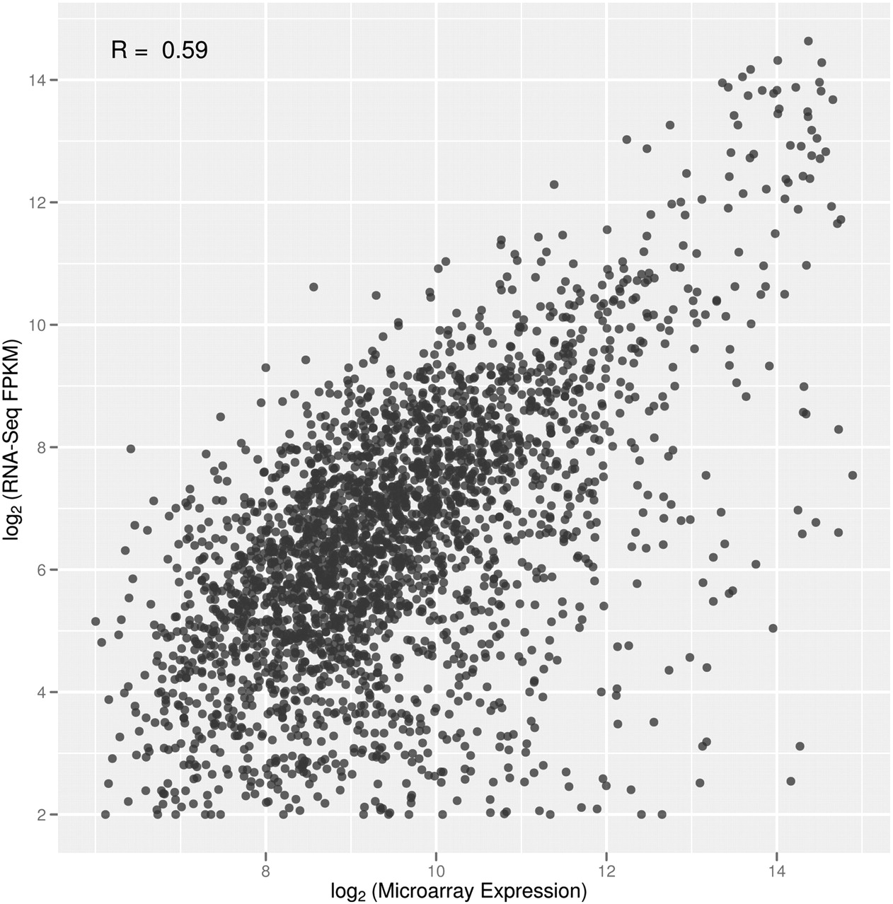 Expression values from RNA-seq and microarray. Comparison of FPKM values (log2-transformed) and microarray signals for the 2597 genes detected by both platforms in 20 unrelated individuals. For each gene, we plotted the average expression values across the 20 individuals.