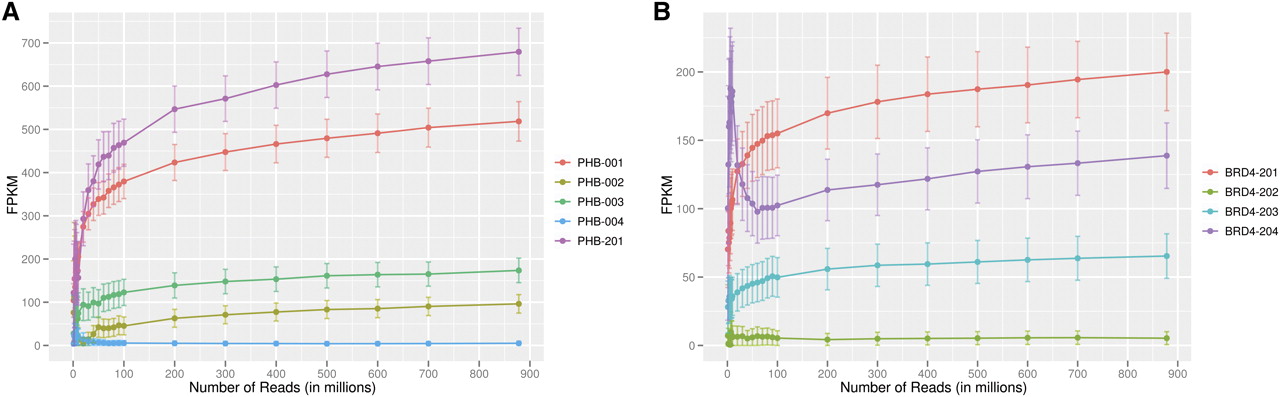 Expression levels versus sequencing depth. We plotted FPKM values for genes and their transcripts at various sequencing depths. (A) FPKM values of five spliced forms of PHB are shown; the least abundant isoform (blue line) of PHB reaches within 20% of its “final” FPKM value with only 60 million reads; however, the expression values of the other four isoforms continued to increase with more reads. (B) FPKM values of BRD4 are shown. With less than 100 million reads, the expression level of BRD4-201 (orange line) is overestimated, while that of BRD4-204 (purple line) is underestimated. (Error bars represent 95% confidence intervals.)