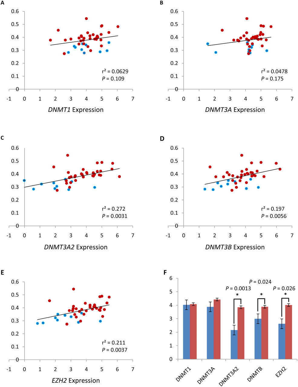 Expression of DNMTs and EZH2 correlates with global hypermethylation in prostate tumors. Comparison of transcript levels of DNMTs and EZH2 measured by TaqMan qPCR with the average DNA methylation levels of CpG sites that are hypermethylated in prostate tumors. (Blue circles) Benign adjacent samples; (red circles) tumor samples. The P-value was calculated by linear regression analysis. y-axis: average DNA methylation levels (beta score); x-axis: relative gene expression levels [log2(RQ)]; (black line) linear regression. (A) DNMT1 expression. (B) DNMT3A expression. (C) DNMT3A2 expression. (D) DNMT3B expression. (E) EZH2 expression. (F) Comparison of DNMTs and EZH2 transcript levels between benign adjacent tissues (blue) and tumors (red). Significant differences are indicated by asterisks; P-values were calculated by t-test. Standard errors are depicted by error bars. For part F, the y-axis is relative gene expression levels [log2(RQ)].