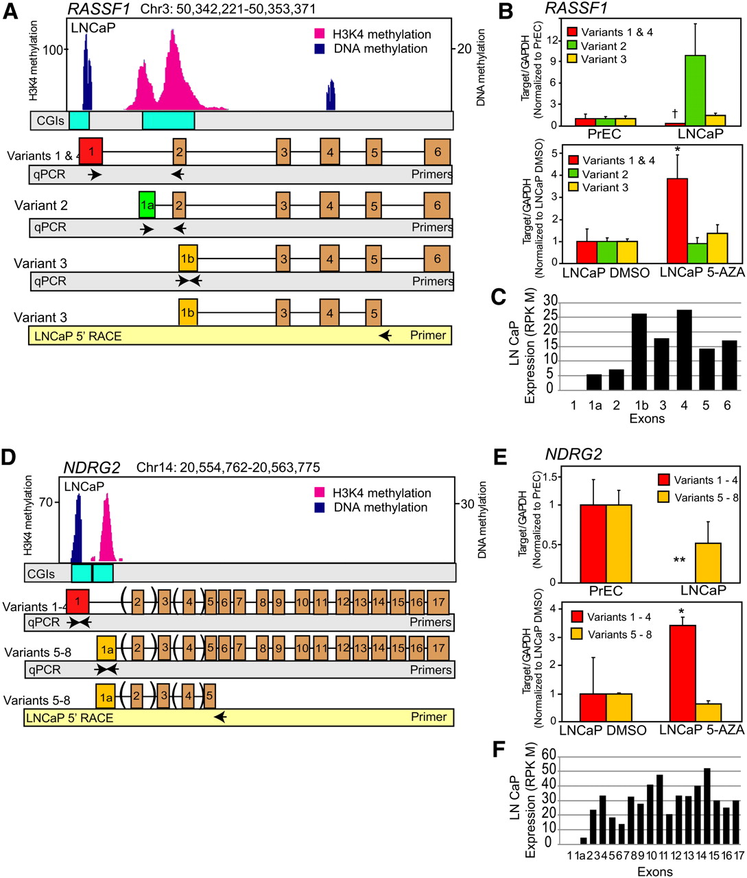 Regulation of alternate transcription start site utilization by DNA methylation. (A,D) Cancer-specific DNA methylation enables switching of alternative transcriptional start sites (TSS) leading to transcript isoform regulation. Next-generation sequencing for DNA methylation and histone 3 lysine 4 trimethylation (H3K4me3) in LNCaP cells reveals genome-wide patterning that couples CpG methylation with H3K4 marks to repress or activate specific transcript variants. Independent epigenetic modifications mark specific alternative TSS. In RASSF1 (A) and NDRG2 (D), CpG methylation occurs at the TSS of the longer variants, with H3K4me3 marks positioned on the TSS of the shorter variants. (B,E) Preferential silencing and 5-Aza-induced re-expression of CpG-methylated variants in LNCaP cells. Variants exhibiting CpG methylation on their TSSs show preferential silencing compared to variants with H3K4me3 marks in LNCaP cells. These variants show preferential reexpression upon treatment of LNCaP cells with 6 μM 5-Aza for 48 h. qRT-PCR data are normalized to variant expression levels in PrEC prostate primary epithelial cells or DMSO-treated LNCaP cells in the respective panels. (B,D) 5′-RACE results validated RASSF1 variant-3 and NDRG2 variants 5–8 expression in LNCaP cells. (C,F) Exon expression values from LNCaP RNA-seq data support the corresponding variant transcription of RASSF1 and NDRG2 genes.
