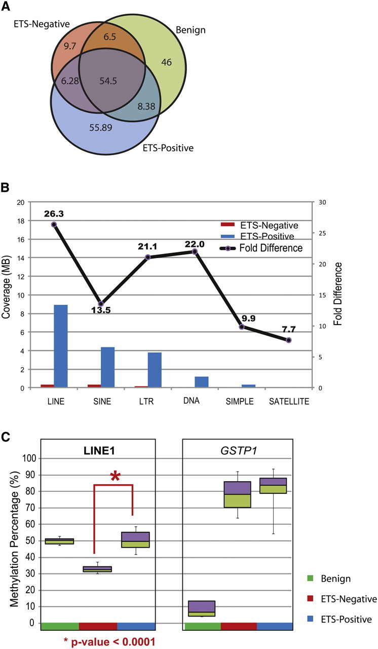 Differentially methylated regions between ETS-positive and ETS-negative samples. (A) Venn diagram displays the methylation overlap observed between ETS-positive (blue), ETS-negative (red), and benign (green) prostate tissue samples. The inset numbers represent the coverage in each section. (B) The coverage for various repeat elements was higher in ETS-positive compared to ETS-negative samples, indicating higher methylation in the former. The fold difference for methylation in each class of repeat element is indicated by the line plot above. (C) Percent methylation was assessed independently by pyro-sequencing assays for LINE-1 elements and GSTP1 gene promoter methylation in prostate tissue panel (benign n = 5, ETS-positive cancers n = 10, and ETS-negative cancers n = 4). LINE-1 methylation was significantly lower (P-value < 0.0001) in ETS-negative samples compared to ETS-positive tissues, while the GSTP1 gene promoter was highly methylated in both cancer subgroups and not in benign.