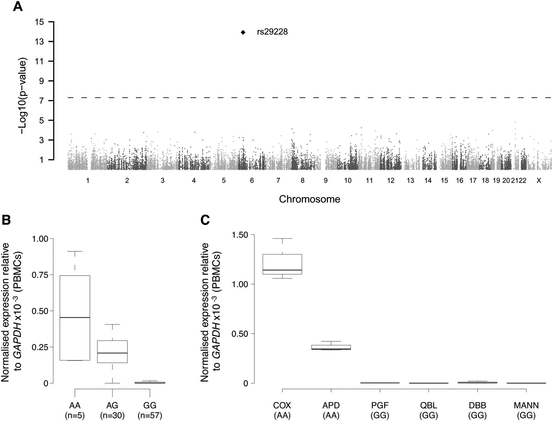 Expression quantitative trait mapping for ZFP57. Expression of ZFP57 was determined by quantitative real-time RT-PCR in peripheral blood mononuclear cells of 93 healthy volunteers and analyzed for association using 45,237 SNPs enriched for immune and inflammatory genes. (A) Manhattan plot showing a highly significant association for an SNP, rs29228, 16.8 kb centromeric to ZFP57. The horizontal dashed line indicates the genome-wide threshold significance. The absence of other association with neighbor SNPs on chromosome 6 is not unexpected due to moderate SNP coverage in the region and low level of linkage disequilibrium. (B,C) Boxplots of ZFP57 gene expression relative to GAPDH depending on rs29228 genotype in 92 successfully genotyped individuals (Kruskal-Wallis test on genotypes, P = 6.7 × 10−11) (B) or for MHC-homozygous lymphoblastoid cell lines (C).