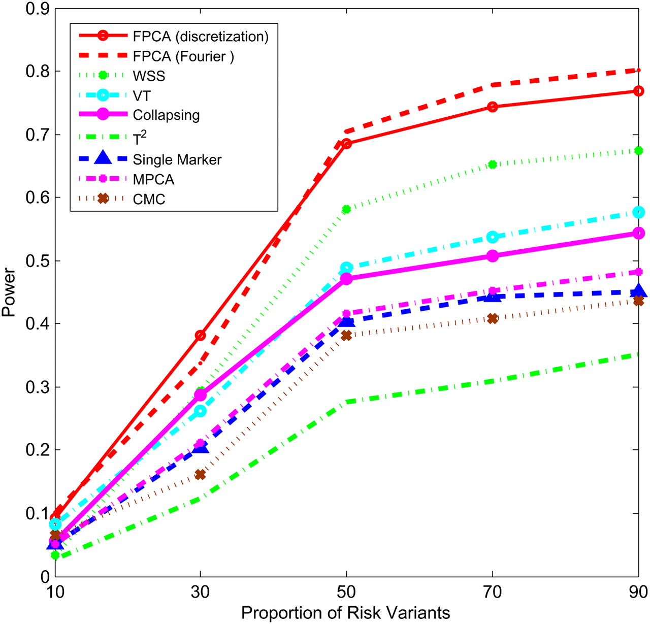 Power of nine statistics: FPCA (discretization approach)–based statistics, FPCA (Fourier expansion approach)–based statistic, multivariate PC–based statistic, WSS, VT, collapsing method, generalized T2 statistic, single marker χ2 test, and CMC method (the variants with frequencies ≤ 0.005 were collapsed) as a function of proportion of risk-increasing variants for testing association of 22 rare variants with the disease under the additive disease model, assuming baseline penetrance of 0.01, 2000 cases, and 2000 controls.