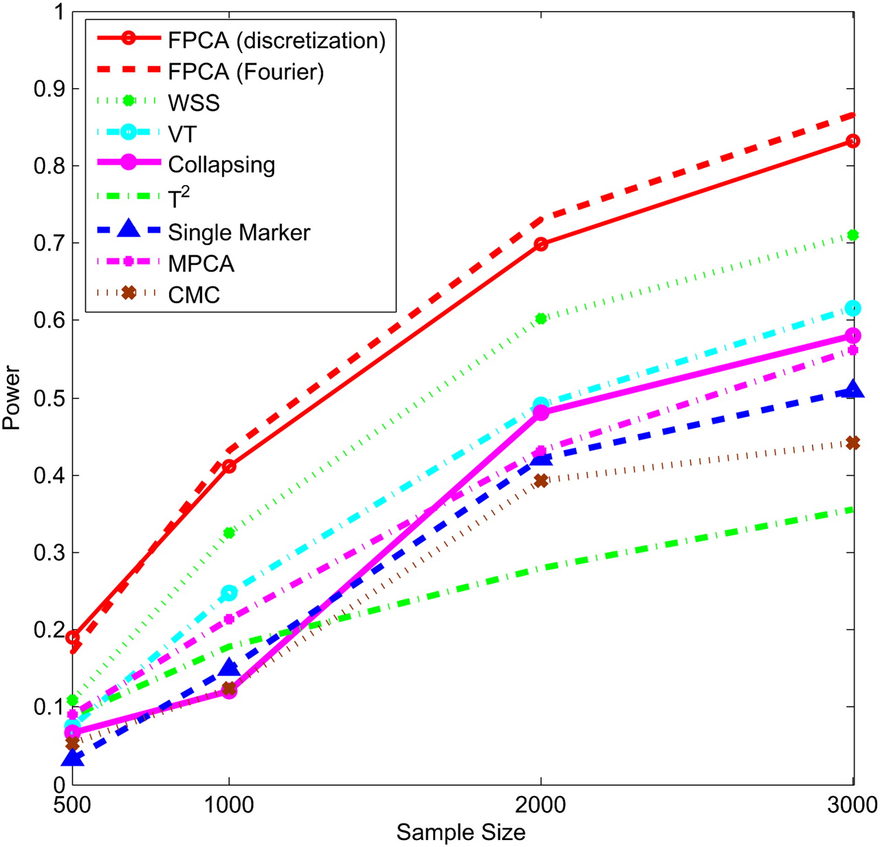 Power of nine statistics: FPCA (discretization approach)–based statistics, FPCA (Fourier expansion approach)–based statistic, multivariate PC–based statistic, WSS, VT, collapsing method, generalized T2 statistic, single marker χ2 test, and CMC method (the variants with frequencies ≤ 0.005 were collapsed) as a function of sample sizes for testing association of 22 rare variants, half of which were risk-increasing variants, with the disease under the dominant disease model, assuming baseline penetrance of 0.01.