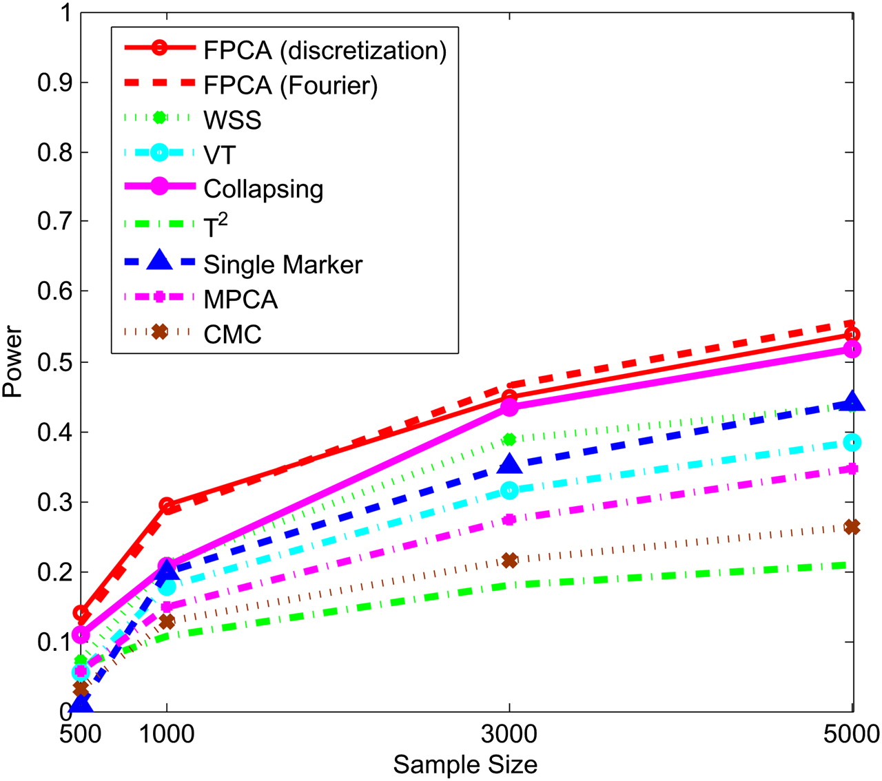 Power of nine statistics: FPCA (discretization approach)–based statistics, FPCA (Fourier expansion approach)–based statistic, multivariate PC–based statistic, WSS, VT, collapsing method, generalized T2 statistic, single marker χ2 test, and CMC method (the variants with frequencies ≤ 0.005 were collapsed) as a function of sample sizes for testing association of 22 rare variants, 70% of which were risk-increasing variants, with the disease under the recessive disease model, assuming baseline penetrance of 0.01.