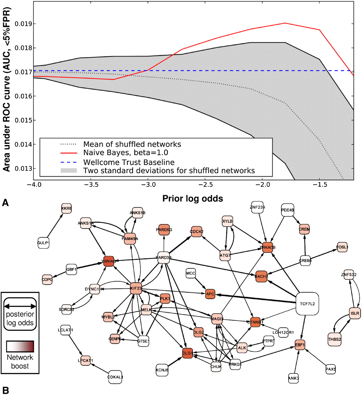 Consideration of the human gene network boosts recovery of validated type 2 diabetes genes from GWAS analysis of 2000 patients and 3000 controls. (A,B) Plotted using the same conventions as in Figure 4, analyzing WTCCC GWAS data (Wellcome Trust Case Control Consortium 2007) for type 2 diabetes alone and in combination with HumanNet and measuring performance as AUC (<5% FPR) for recovering the top 20 genes from a type 2 diabetes meta-analysis of 4549 cases and 5579 controls (Zeggini et al. 2008). As for Crohn's disease, consideration of the network boosts performance across a wide range of parameter values. Notably, consideration of the network strongly implicates the genes CTNNB1 and BACH2 in type 2 diabetes; CTNNB1 is well studied in connection with type 2 diabetes and BACH2 has been previously implicated in type 1 diabetes and celiac disease (e.g., Cooper et al. 2008; Madu et al. 2009), but not type 2 diabetes.