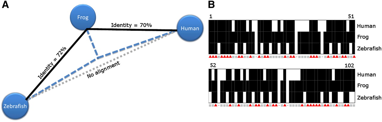 Conservation tunneling. (A) Phylogenetic tree constructed for three orthologous sequences in human (hg18: chr18:53271349–53271555), frog (xenTro2: scaffold_97:133388–133595), and zebrafish (danRer5: chr24:28243171–28243307). Only the human and the frog sequences and the frog and the zebrafish sequences can be aligned (with at least 70% identity across at least 100 bp). The frog sequence has evolved more slowly relative to the human and zebrafish sequences, and thus, can be used to establish the orthology of the diverged human and the zebrafish sequences. (B) Pairwise sequence comparisons. Eighty-seven percent of frog nucleotides are conserved in either human or fish (gray squares), while only 42% are conserved in both human and fish (red triangles).