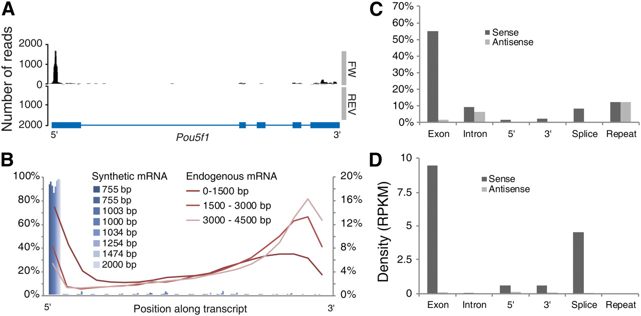Read distribution. (A) Example of reads mapped to both strands of the 5-kb Pou5f1 locus, shown as a coverage plot. The gene structure is shown in blue below the graph. Most reads aligned near the 5′ end of the gene. (B) Density of reads as a function of the position along the transcript, in 5% length bins. The figure shows eight synthetic mRNA (blue bars) and averages for all genes categorized by transcript length as indicated. (C) Read-mapping statistics, showing the fraction of all mapped reads that overlapped each type of annotation (cf. Fig. 1B). The vertical scale shows the percentage of all reads that mapped to exons, introns, splice junctions, 1000 bp upstream of and 1000 bp downstream from transcriptional units, and known repeats. In each case, the black bar shows reads mapped in the sense orientation, and the gray bar shows reads mapped in antisense. Repeats were not directionally annotated and therefore were hit equally on both strands. (D) The same statistics as in C but normalized for the total length of each feature class, expressed as RPKM. This shows more clearly the level of enrichment of exons versus introns, demonstrating good specificity for mRNA and rejection of genomic DNA and/or inspliced intronic RNA.