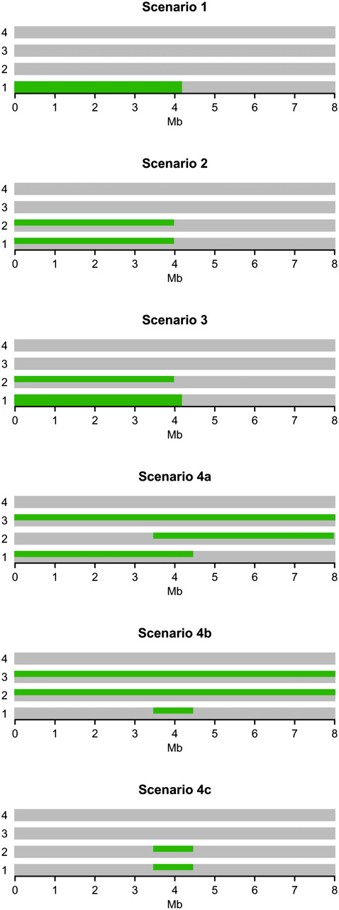 The IBD scenarios used in the power analysis. For each of the scenarios there is one colored line for each of the eight chromosome sequences. In addition, each column represents a locus in the data set. If a chromosome sequence in a given locus is green it means that it is shared IBD with all the other chromosome sequences of this color in that locus. If it is gray, it means that it is not IBD with any of the other chromosomes.