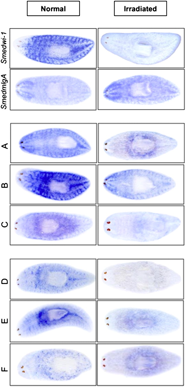 Enriched expression of novel BISMB transcripts in planarian stem cells. Whole-mount in situ hybridization was performed on normal and irradiated asexual planarians using either smedwi-1, smedmlgA, or novel BIMBSB transcripts (human homologs) labeled: A (Misu or NSUN2), B (MOV10L1), C (LRRK2), D (HES5), E (RNMTL1), and F (CWF19L2). See Supplemental Table 7 for details.