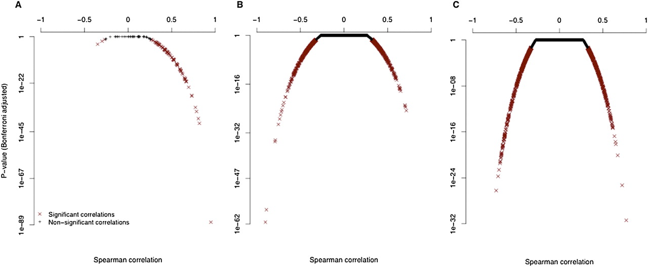 SAS genes tend to have concordant expression and antisense-correlated splicing events. (A) The majority of SAS gene pairs have positively correlated gene expression values across the 176 LCL samples. (B,C) Individual probesets in known (B) and novel (C) SAS genes, have either positive or negative correlations (x-axis) between their SI values and the expression of the antisense gene or construct (the y-axis is the Bonferroni-corrected P-values of Spearman correlations).